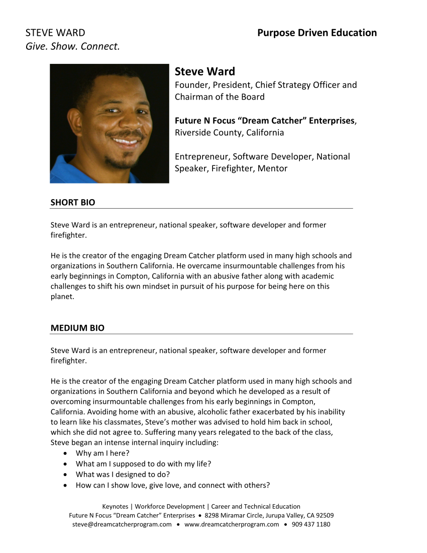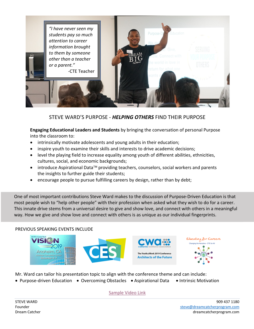 Steve Ward, the Founder and Creator of Dream Catcher, is a tremendous asset for any speaking forum. As a Leader in Purpose Driven Education, Steve inspires and guides individuals in discovering or refining their purpose and leveraging it to drive intrinsic motivation, success or change in their lives, communities, or organizations. Steve tailors his transformative and uplifting sessions to the theme of any event, customizing his graphics with your logos, uplifting and re-energizing your students, staff or teams.